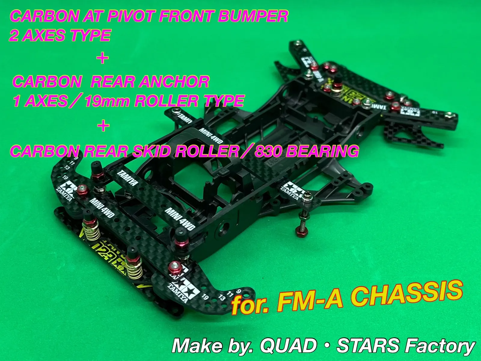 | 商品の特徴 | ミニ四駆・FM-Aシャーシ用】2軸ATピボットバンパー+1軸リヤ。完成品ユニット】ミニ四駆パーツ 2軸ATピボットバンパー+1軸。ミニ四駆・MSシャーシ用】2軸ATピボットバンパー+1軸リヤ。☀️お得な【まとめ買い申請】募集中☀️⚠️こちらのカーボンユニットは、ミニ四駆のセットアップにある程度慣れた【中級〜上級者向け】のカスタムパーツです⚠️◉2軸ATピボットバンパーのレシピ・MAシャーシ/ブラック(ABS) ×1・リヤブレーキステー/J-CUP2022 ×1・フロントワイドステー ×3・マルチ補強プレート ×1・スーパーXマルチ強化プレート ×1【スライドダンパー用スプリング(4種類付属)】◾️ピボット部分:ハード/シルバー ×2◾️2軸部分: ミディアム/ゴールド ×2【交換用】◾️ソフト/ブラック ×2◾️スーパーハード/シルバーメッキ ×2◉1軸リヤアンカー/19mmローラー対応のレシピ・リヤブレーキステー/J-CUP2022 ×2・マルチワイドリヤステー/J-CUP2024 ×2・直カーボン ×3・キャップスクリュー/2×20.3mm ×1◉ローラーアンダーガード・リヤブレーキステー ×2・アルミスペーサー/3mm ×4【ダンガン用タルバネ(2種類付属)】◾️1軸部分:ハード/シルバー ×1【交換用】◾️ソフト/ブラック ×2⚫︎カーボンユニットの重さ:約48.0g※シャーシ含む【追加オプション】①ピボット稼働部分/段差げ3mm厚加工 2,998円②フロント提灯/カーボン 3,998円③リヤスキッドローラー/830ベアリング 4,998円④シャーシ軽量化+低重心加工 2,598円⑤MAシャーシ用・Aパーツ 598円✅1軸リヤアンカーを13mmローラー対応に変更、✅強化タイプ(PC+ABS)シャーシに変更、✅シャーシのカラー変更、✅ロックナットのカラー変更など、その他のご要望も【コメント欄】から承ります^ ^↓↓よろしければ他にも出品していますのでこちらも併せてご覧ください↓↓#QUAD・STARS/MAシャーシの商品一覧はこちら#QUAD・STARS/カーボンの商品一覧はこちら↑↑タップでミニ四駆のみの見やすいページに飛びます↑↑【ご案内】・タミヤ純正パーツのみを取り扱っておりますので、公式レースでも安心してご利用いただけます。ミニ四駆・MAシャーシ用】2軸ATリジットバンパー+1軸リヤ。・カーボンユニット、シャーシ以外は別売ですm(_ _)mNo.7-33 | ||
